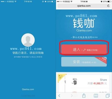 3.安装完成后,返回手机界面找到“钱咖钥匙”,点击打开,页面提示“钥匙已激活.............”,然后再次打开浏览器,点击“进入”,如图: