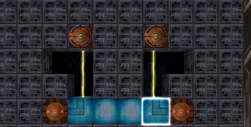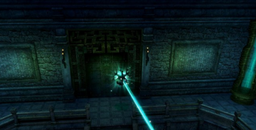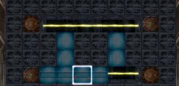 1、首先是最初外面遇到的机关,需要居十方来操作解开,这个原理很容易理解。只要让核心是绿色的光线发射装置发出的射线,最终射入到核心是灰色的装置即可。有实心的蓝色元件和可以改变方向的引导元件,如何搭配还是很好理解的。