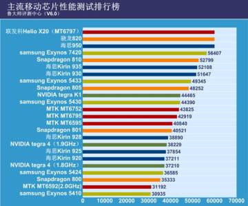 目前联发科Helio X20(MT6797)、骁龙820以及海思麒麟950尚未量产,暂无跑分,但以曝光情况来看,稳居前三。而已正式发布并开始投入使用的芯片中,三星Exynos 7420、骁龙810、海思麒麟935则紧随其后。