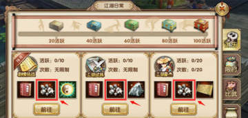 玩家可在游戏界面右上玩法活动功能按钮中点击进入“江湖日常”,查看、选择、参与诸多带有碎银奖励的玩法和活动,赚取碎银。