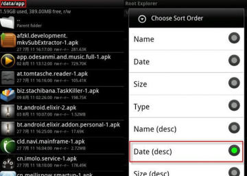 当你发现无论安装什么软件都提示安装超时的时候,一定要第一时间打开Root Explorer,进入data/app文件夹,然后点击Perferences,在Sort order一栏点击Date(desc)按钮: