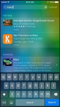 更重要的是,Spotlight搜索功能开放了API,还能搜索包括第三应用程序提供的app内信息,确保用户搜索到的信息更可靠、更丰富、更人性化、更具联动性。