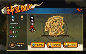 消耗道具或者金币,可对神器进行强化,强化次数越多,神器等级越高。