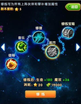 修炼玩法可以为所有上阵伙伴和替补增加属性,玩家可以从考古、厨艺、剑术、航海、狙击、领导、音乐、修理、医疗等方面来进行修炼,修炼后可以获得生命、物攻、魔攻等方面的提升,从而提升队伍的战斗力!