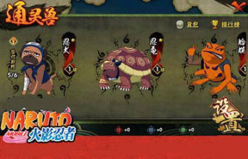 目前有忍犬(通灵术1层开启)、忍龟(通灵术6层开启)、蛤蟆(通灵术20层开启)、蓝蛇(通灵术45层开启)、猿魔(通灵术100层开启)、蛞蝓(VIP6开启)一共6种通灵兽可以帮助大家战斗,而且在战斗中所有通灵兽都是可以按照设置的出场顺序依次出场的。