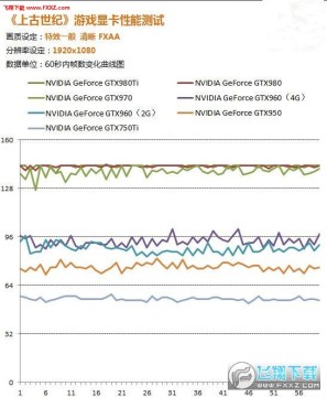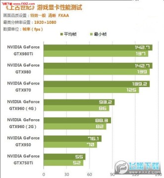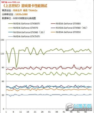在1080P分辨率主流画质设定下,GTX 980 Ti的平均帧数达到了125FPS,即便是本次参测的最低端GTX 750 Ti显卡,平均帧数也达到了30FPS,虽然最小帧只有24FPS,但从曲线图上来看,GTX 750 Ti的游戏帧数非常稳定的保持在30FPS,作为《上古世纪》游戏显卡的基础选择已经足够。
