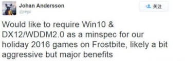近日,有玩家在推特上扒出了DICE技术主管Johan Anderson曾经发布的推文,在推文中Anderson称基于寒霜引擎打造,并将在2016年圣诞假期推出的游戏将仅支持Win10/DX12/WDDM 2.0。
