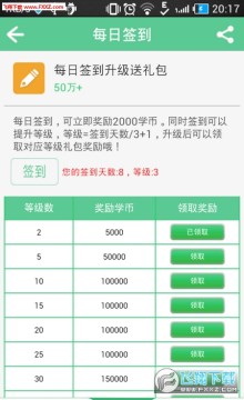 首先就是签到了,大家每天在这里签到都会得到2000学币,所以不管遇到什么情况,你每天起床要做的第一件事情就是打开软件签到了,2000学币不要白不要