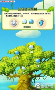 富饶金银果树,果实成熟后会产生金币或者精力,如果不想要金币,可以重生果树,直至生成精力(每天可领取的数量有限,果树等级越高,可领取的越多,满足升级要求后不要忘记了升级哦)