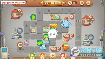然后我们趁小怪物停止出现的时候攻击最靠出口处的障碍物,然后放置冰冻星 可以减慢小怪物的行走速度。这时我们一定要注意在四周放上武器攻打他们,然后再在阿波的旁边放置魔法球(记住一定要是魔法球哦~)然后升级,接着清理障碍物。