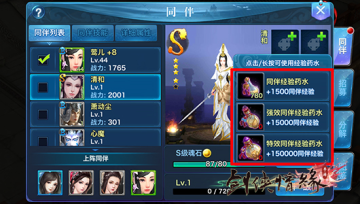 升级就是获取经验。在同伴的升级过程中,获取经验有两种方式,一是跟随角色过剧情关卡,二是使用经验药水。前者不多说,主要谈一下经验药水的获取方式。经验药水分为三种:普通、强效、特效同伴经验药水,所加经验分别为1500、15000、150000,普通的经验药水可以从剧情关卡中获得,更高级的经验药水可以在家族的天工坊可以购买到。