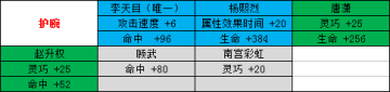 护腕魂石主要推荐魂石李天目(唯一)、杨熙烈、唐潇、赵升权(李天目:唯一攻速属性有能力必选,杨熙烈:增加控制效果时间,唐潇:生命跟灵巧赵升权:灵巧和命中),平民选择魂石顾武、南宫彩虹(顾武:命中,南宫彩虹:灵巧)。
