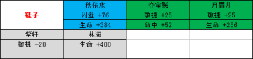 鞋子魂石主要推荐魂石秋依水、夺宝贼、月眉儿(依水:闪避和生命,夺宝贼:敏捷和命中,月眉儿敏捷和生命),平民选择魂石紫轩、林海可以重复镶嵌实惠型,属性加成也都还不错(紫轩:敏捷,林海:生命)。