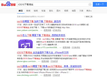 接下来小编要推荐的是在国内的下载网站上下载iOS10固件,这里我们进入到百度,然后搜索一下iOS10下载类的词汇。