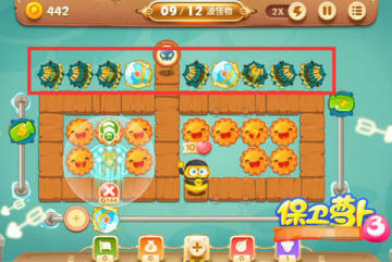 2、中期开始在中间两个方形内大量补充太阳花提高输出,记得可以在出怪地方,放一个雪球,出怪就被减速!