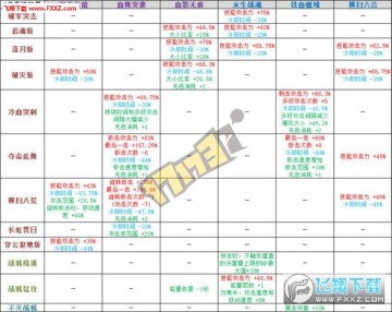 表2,可以看出寂灭长歌6对于[破灭斩]技能攻击力的增加已经达到50%,同时减少了30%冷却时间,和血影无痕3散搭[破灭斩]攻击力和冷却增幅明显,可以做6+3;还有[横扫八荒]技能攻击增加20%,冷却时间减少25%,攻击范围和移动速度增加,增加的比较全面(但没什么卵用)。血舞突袭6对于[冷血突刺]、[夺命乱舞]、[横扫八荒]这3个出了名的墨迹技能增加技能攻击力很明显,也减少了攻击次数,使得技能不那么墨迹,不过和9件套比起来还差得有点儿远。血影无痕6,小技能加的太明显,显然这套不可能做为输出套了,搬砖效果很好。永生战魂6,你还是也去搬砖吧。横扫六合6,你也跟着去搬砖!最后,铁血疆域6,[不灭战戟]换装必备(20级不灭+铁血6=60%暴击伤害)。