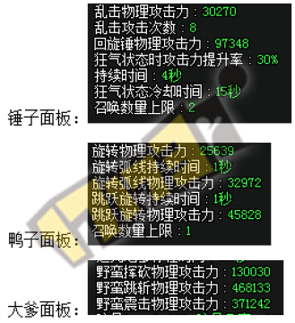 ①、技能面板低:从技能面板上不难发现数据的大小,不过考虑到攻击频率以及组队伤害丢失等问题后,组队后锤子和鸭子的整体碾压伤害接近,锤子短时间内爆发不如大爹的“屁股”碾压伤害。
