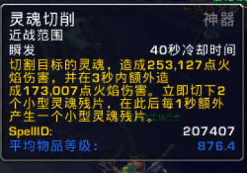 灵魂切削:可以造成对目标释放邪能之力,立即造成(相当于980%武器伤害)的火焰伤害,在3秒内额外造成(3+450%AP)的火焰伤害,并立刻产生2个小型灵魂碎片,在此后每1秒额外产生一个小型碎片,冷却40秒。