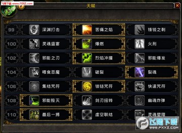 这套天赋主要讲一下104层级及110层级。我选择裂魂(恶魔变身下获得50%吸血的天赋,非基础技能)的最大原因就是我天真的认为配合献祭----灌入痛苦----主动变身----假死----焦油战刃----裂魂是一套很流弊的Combo,实际上这样的打法也在BETA里实际救过我很多次。当场面很危急由献祭触发小灵魂片----裂劈后变身4秒回复----接主动变身回复----再拍死出110级假死进入恶魔形态再吸血又是一条好汉的荡气回肠的模式,
