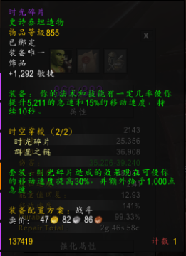 迷离时刻(神器大特质):冲动持续期间你的技能的冷却回复速度提高15%。可以作用于神器技能。冲动15秒时间,可以理解为所有技能减少X-(X/1.15-15)*1.15-15=2.25秒的时间。当配合精准定位的时候,冲动时间内每消耗1颗星,减少cd:2*1.15=2.3秒。