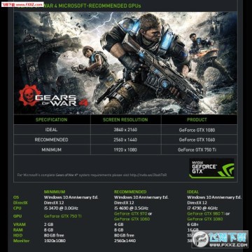 首先先说说游戏的配置,微软和NVIDIA都发布了三层硬件配置,分为“入门(Minimum)”、“建议(Recommended)”和“理想(Ideal)”,大家可以互相参考显卡和其他设备的需求,根据NVIDIA的描述,一块GTX 750 Ti在“中等(Medium)”和“低档(Low)”混合的画面设置下,可以在1080P分辨率下跑出45帧的水平。《战争机器4》本事为DX12独占游戏,因此你需要一块支持DX12的显卡以及Windows 10的支持。