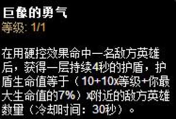 事实上,在之前的天赋经过一次大改后,整个游戏就曾经变成了“雷霆联盟”。后来经过了几个版本的平衡性调整后,才出现了天赋上百花齐放的场面。不过,这一次的天赋改动,或许会再次出现一个“巨像联盟”也说不定。没错,今天我们说的这个天赋就是季前赛最新出现的“巨像的勇气”,那么在具体分析这个天赋之前,我们先来看看它的描述。