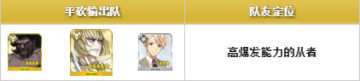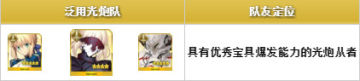 最常见的刷狗粮队伍,任何拥有优秀光炮宝具的从者都能携带开局NP礼装进入此队,除了全满破宝石翁的欧洲人之外,基本战术是迅速将全队NP攒满,用3个高爆发的光炮清空全图。可以根据敌对职阶灵活选择入队的光炮英灵。注意点在于面对单体高血量boss带两个小兵的阵容时,由于杀死小兵会使boss行动回数增加反而提高难度,因而此队伍不适用这类战斗。在开放宝具本之后,对弓阶以外敌人彩笔基本也能保证击杀,因而适用于大部分副本。考虑到目前狗粮本配置情况,队友适合其他剑阶和术阶光炮从者。如果遇到活动本等其他职阶组合则视情况而定。