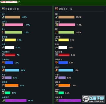 联盟:圣骑增加0.4%,死骑增加0.3%,法师、牧师、德鲁伊、武僧增加0.2%,萨满、术士增加0.1%;恶魔猎手减少1.6%。