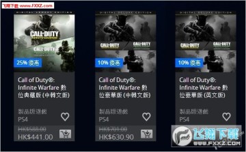 《使命召唤:无限战争》:典藏版75折,441港币(折合人民币399.1元);豪华版9折,需要注意的是打折两个版本均包含《使命召唤:现代战争 重制版》