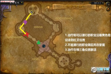 神牧吃隐身药水,其他可以潜行/隐身的职业比如法师猎人盗贼之类的和牧师一起走到红叉位置。之所以走右边是因为右边有小怪的路径比较短,即便不开加速也足够在隐身时间内跑到指定位置。其他不能隐身的职业请在牧师快到的时候走到紫菱死掉。切记如果有人引怪的话也请回到紫菱死掉。在这些人被怪痛殴的时候,牧师在红叉开加速跑到绿三角位置群活。如果小队成员死的比较多的话可以补大餐,否则直接倒数偷药开boss(打完boss之后会有一段对话时间给大家补食物)。