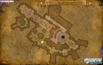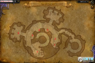 上楼以后首先遇到的是虫语者和剑圣,此处先把左侧虫语者(图中1)和巡逻的剑圣(图中2)拉起来A掉,然后34、56分两拨打掉(拉6是因为要补老一之前跳过的小怪),最后打7。