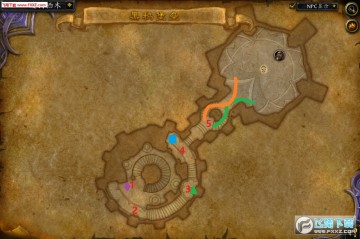 一号boss打完开门以后,T拉着小蜘蛛往楼上跑,有豹奔的话开一下。此时神牧要开好加速,尽量跟上T,躲好绿圈,千万不要卡视角。一旦T身上的debuff超过10层,立即驱散。在图中绿三角处清理掉小蜘蛛,然后拉着大蜘蛛和图中1号位置的3只小怪一起打。