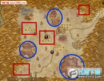 四个框是营地,3个圈是刷巨甲虫的虫巢。