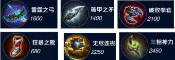 后期装备:雷霆之弓,破甲之矛,破败拳套,狂暴之靴,无尽连枷,三相神力