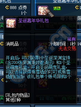 每个帐号限购买一次,只能使用点券购买,可以获得1个圣诞深渊宝珠(200张深渊派对邀请函)和1个圣诞萌宠礼盒(乘雪橇的叮叮/乘雪橇的铛铛2选1)