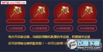 每次开启秘宝箱,均能获得随机数量的幸运值,积攒满幸运值后可获得秘宝箱钥匙奖励!一共可以获得4次哦!