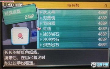 红线,在阿卡拉岛皇家大道皇家巨蛋里中央柜台右边数起第一个柜员以48BP换取。作用:携带红线的宝可梦参与生蛋时,子代会遗传双亲的随机5项个体值。父代和母代各有6项个体值,加起来一共12项个体值。这个道具是用来控制子代个体值变数的。