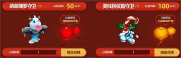 2使用钻石兑换守卫皮肤,其中50钻石兑换一份“萌萌魄罗守卫(7天)”,将获得赠“普通新春灯笼”一份;100钻石兑换一份“美味拐杖糖守卫(7天)”,将获得赠“闪亮新春灯笼”一份。兑换多份珍稀守卫皮肤,使用时间叠加计算。