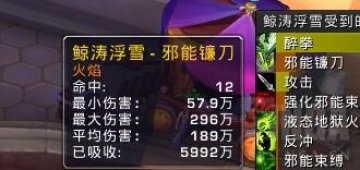 邪能镰刀:这是整场战斗中最危险的技能。根据地下城手册满能量的邪能镰刀是1986728*600%也就是1192万伤害,除去火息和全能的减伤后打在两件套神秘坚定天赋的酒仙身上是300万左右伤害,和skada统计基本相符。我们要做的是尽量用减伤覆盖每一个满能量的邪能镰刀。在团血稳定、治疗压力不大的时候可以光靠铁骨硬吃一个,而团队在走位、自身血线不安全的时候,一定要开启减伤,没有就和治疗沟通要技能。