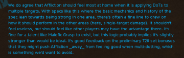 我们承认,在对多目标施放dot的时候,痛苦术士是最有宾至如归的感觉的。对于这种基于基础机制和专精历史,而在一个领域内表现强力的专精,通常会画一条线以表示它是如何在其他领域表现的(这里指单目标伤害)。它不应该被认为是无用的,但是应该认为其他玩家可能会有优势。对于像灾难之握这样的天赋来说还不错,但是这个逻辑可能意味着它比理想情况还要强一些。对于初期的T20套装奖励来说这是个良好的反馈。它们可能会使痛苦术士远离多目标dot的良好感觉,这也是我们想要避免的。