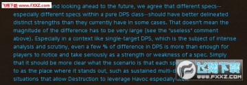 从广义的角度来展望未来,我们承认不同的专精 - 特别是纯DPS职业中的不同专精 - 应该在某些情况下更能体现出明显的优势。这并不意味着差异的幅度必须非常大(见上面的“无用”评论)。 特别是在像单目标DPS这样的背景中,这是个被极度分析和审查的主题,即使DPS差了几个百分点,也足以让玩家注意到并认真对待专精的优势或弱点。简单来说,每个专精都需期望它所突出的方面,例如痛苦术士的持续多目标dot,或者某些让毁灭术士把浩劫发挥到极致的场合。