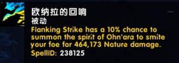 欧纳拉的回想:侧翼打击有10%几率召唤欧纳拉重击你的敌人造成1000%攻击强度伤害。(之前的效果:艾特洛回响(新特质RANK1):侧翼打击有几率召唤胡恩·高岭和艾特洛之魂重击你的敌人。)