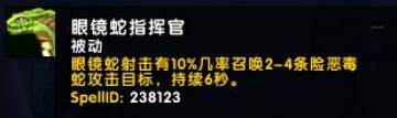 眼镜蛇指挥官(神器特质):眼镜蛇射击有10%几率召唤2~4条恶毒蛇攻击目标,持续6秒。(之前的效果:眼镜蛇指挥官新特质RANK1:眼镜蛇射击有几率产生X条狡诈的毒蛇攻击目标直到取消。)