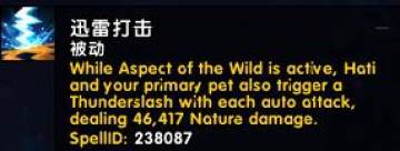 迅雷打击(神器专长):重新设计,野性守护激活时,哈提和你的主要宠物的每次自动攻击还会触发迅雷打击,造成100%攻击强度点自然伤害。(之前的效果:雷霆猛击新特质RANK1:野性守护让所有激活的宠物猛击地面,对5码内的敌人造成XXX物理伤害。)