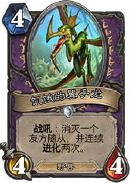饥饿的翼手龙:这张卡牌的效果和暴掠龙幼崽的效果是类似的,这张卡牌也是将我们的场面优势换为实际的随从优势,这样的卡牌在动物园体系中无疑是非常的受欢迎的,自身4/4的身材实在要裸上我们也能够接受,同时火羽精灵补充的一张1费卡牌也能够很好的配合这张卡牌,一旦获得进化效果并且是连续两次的,对于局面的帮助那无疑是非常的巨大的。
