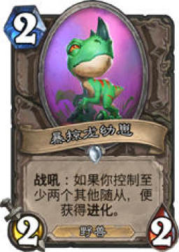 暴掠龙幼崽:这张卡牌非常的适合我们动物园体系,能够很好把前期铺场获得场面优势转化为实际的随从优势,2费卡牌能够获得进化对于局面的帮助也很大,往往建议大家选择属性的加成,或者亡语的随从这些都是不错的,另外为了能够很好的激活这张卡牌,我们在1费都选择的非常具备站场能力的卡牌比如火羽精灵,村民这样的卡牌。