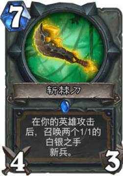 前期的站场利器,不管是对海盗战、猎人还是术士,都是非常好用的卡牌,能够做到较好的解场,同时也能与光铸剑龙和新职业橙守日者进行较好的配合。
