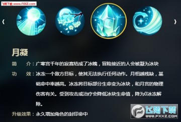 月凝:冰冻一个敌方目标,使其无法执行任何动作。命中率仅和月相有关,月相越残缺,命中率越高。冰冻将目标部分生命变为冰块,和月宫的物理伤害有关。受到攻击或治疗会降低冰块生命值,降为0冰冻解除。