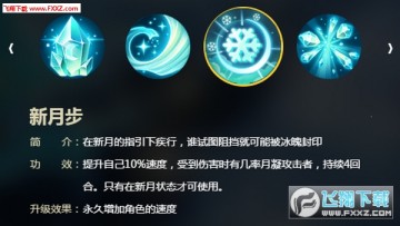 新月步:提升自己10%速度,受到伤害时有20%几率冻结攻击者,持续4回合。只有在新月状态才可使用。