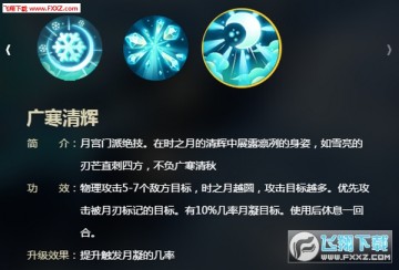 广寒清辉:月宫门派绝技,物理攻击5-7个敌方目标,时之月越圆,攻击目标越多。优先攻击被月刃标记的目标。有20%几率冰冻目标。使用后休息一回合。